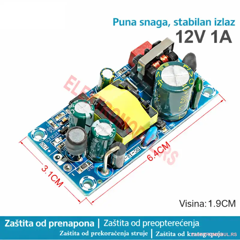 { “@context”: “https://schema.org”, “@type”: “Product”, “name”: “AC-DC napajanje 12V modul – Cena Srbija”, “description”: “Univerzalni ugradni SMPS modul 12V (1A–8A) sa izolacijom, 100–240V AC ulazom, visokom efikasnošću i zaštitama OVP/OCP/SCP.”, “brand”: {“@type”: “Brand”, “name”: “SUSWE (ili ekv.)”}, “category”: “Power Supply”, “material”: “FR-4 PCB, elektronske komponente”, “additionalProperty”: [ {“@type”:”PropertyValue”,”name”:”Ulazni napon”,”value”:”100–240V AC (50/60 Hz) ili 110–370V DC”}, {“@type”:”PropertyValue”,”name”:”Izlaz”,”value”:”12V DC, 1A–8A po modelu”}, {“@type”:”PropertyValue”,”name”:”Zaštite”,”value”:”OVP, OCP, SCP, OTP (po seriji)”} ] }