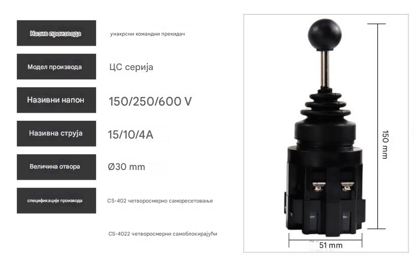 CS-402 četvorosmerni joystick prekidač je visokokvalitetna industrijska komanda namenjena za precizno upravljanje mašinama i uređajima. Sa samopovratnim mehanizmom i robusnim dizajnom, ovaj prekidač omogućava pouzdanu kontrolu u četiri smera — idealan za aplikacije koje zahtevaju brzu reakciju i dugotrajnu izdržljivost.