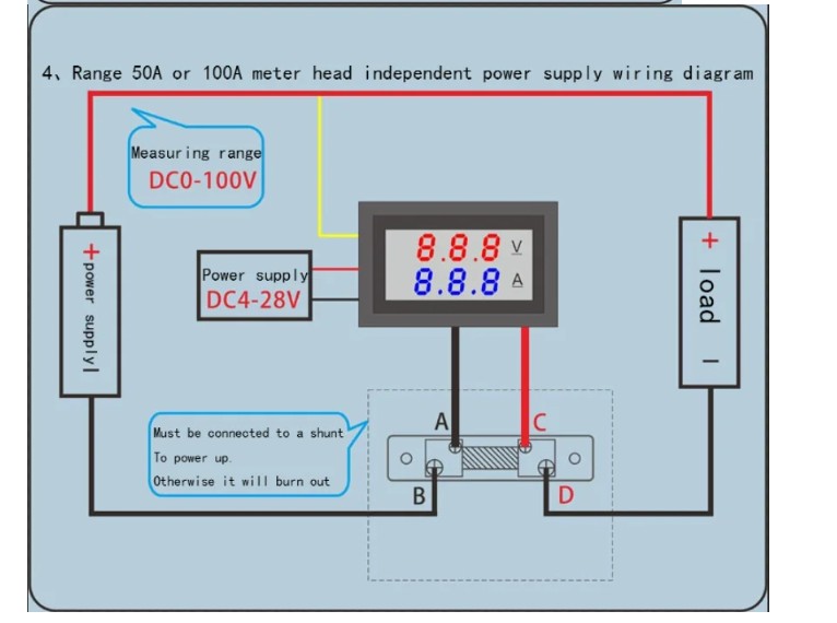 ⚠ Napomena: Uređaj nema zaštitu od obrnutog polariteta. Nepravilno povezivanje može trajno oštetiti uređaj. Potrebno je pažljivo pratiti šemu povezivanja. Posebno kod 50A i 100A verzija – korišćenje odgovarajućeg šanta je obavezno.