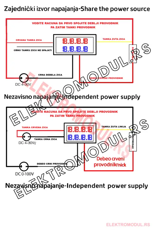 Ključne reči: digitalni voltmetar, digitalni ampermetar, DC 0–100V, 10A, 50A, 100A, šant otpornik, crvena i plava LED, merna instrumentacija.