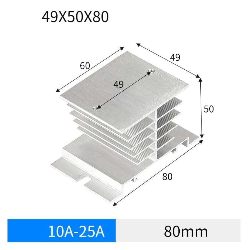 Aluminijumski hladnjak za SSR (solid state relej) predstavlja neophodnu komponentu za stabilan rad i dug vek SSR releja u opsegu od 10A do 25A. Dimenzije 49 x 50 x 80 mm omogućavaju odličnu disipaciju toplote, posebno kod većih opterećenja i rada pri povišenim temperaturama.