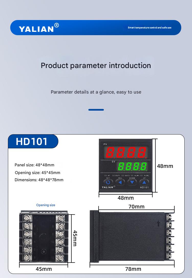 Kompatibilan je sa čak 10 različitih tipova termo-parova i RTD senzora (Pt100, Cu50 itd.), a korisnik lako bira tip signala direktno na panelu. Pored mogućnosti upravljanja grejačima i hladnjacima, zahvaljujući izlazima za SSR i relej, HD101 se može koristiti i za složenije automatske sisteme upravljanja.