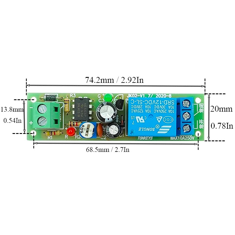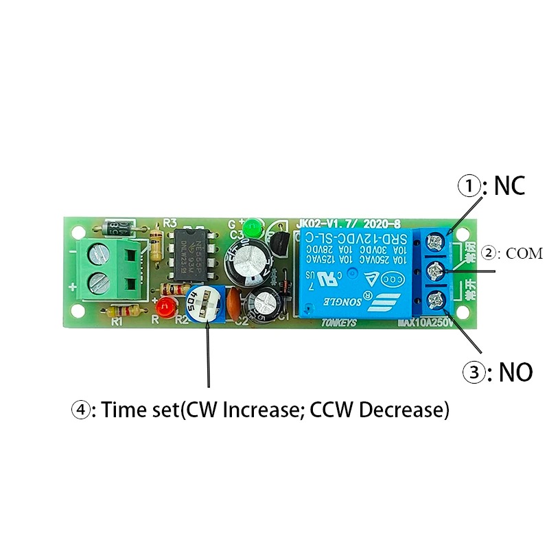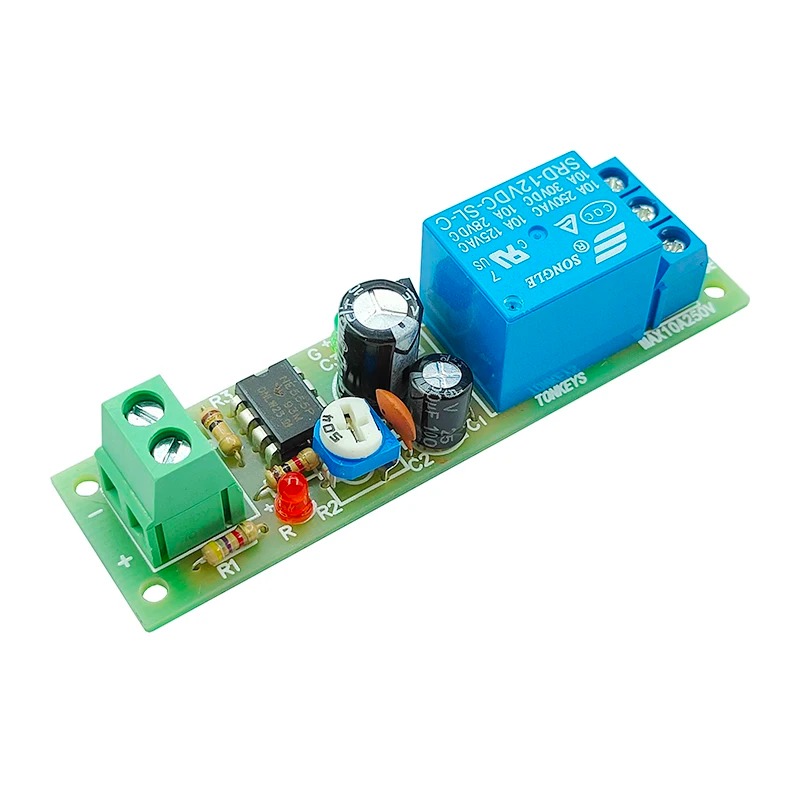 Relej sa kašnjenjem 12V je jednostavan i pouzdan modul za jednokratno odlaganje uključivanja uređaja bez kružnog ponavljanja. Koristi NE555 čip kao vremensku bazu, obezbeđujući stabilne performanse i lako podešavanje vremena od 0 do 200 sekundi putem potenciometra.