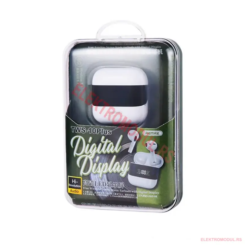 REMAX TWS-10Plus TWS Bezicne Slusalice – Cena Srbija spada u kategoriju premium TWS slusalice sa digitalnim displejom. Po pristupacnoj ceni od 2.470 din donosi pouzdanu funkcionalnost i kvalitet karakteristican za REMAX brend, koji je sirom prepoznat kao proizvodjac dobre vrednosti za novac u svetu mobilne i kucne elektronike.
