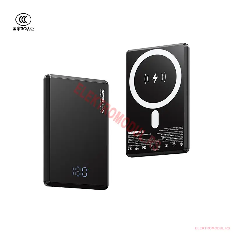 REMAX RPP-107 20W Metal Wireless Power Bank sa Displejem je prenosna baterija (power bank) kapaciteta 10000 mAh sa 20W (cabled) + 15W wireless fast charging tehnologijom. Premium metalno kuciste sa digitalnim displejom (procenat baterije). 20W zicno + 15W wireless — punite telefon samo polozite na power bank. Po pristupacnoj ceni od 3.028 din nudi dovoljno energije za 3-4 puna punjenja prosecnog pametnog telefona.