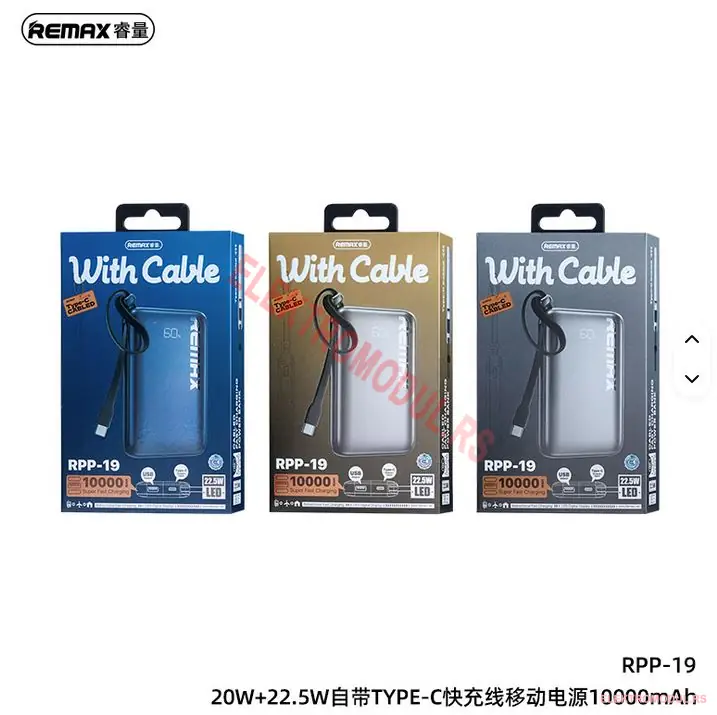 REMAX RPP-19 Blue 20W+22.5W TYPE-C Power Bank je prenosna baterija (power bank) kapaciteta 10000 mAh sa 20W PD + 22.5W QC fast charging tehnologijom. Plava boja sa USB-C kablom integrisanim u kuciste — sve potrebno za punjenje uvek pri ruci. PD 20W za iPhone, QC 22.5W za Android. Po pristupacnoj ceni od 2.650 din nudi dovoljno energije za 3-4 puna punjenja prosecnog pametnog telefona.