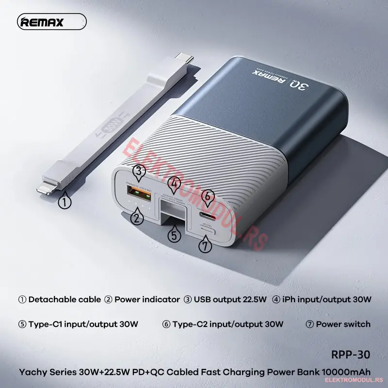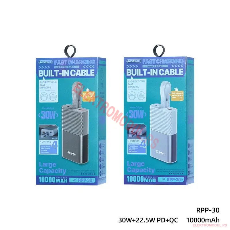 REMAX RPP-30 10000mAh 30W+22.5W Power Bank sa Kablom je prenosna baterija (power bank) kapaciteta 10000 mAh sa 30W PD + 22.5W QC fast charging tehnologijom. NAJJACI cabled model — 30W PD moze da napuni i USB-C laptop (MacBook Air, iPad Pro), sto vecina power bank-ova ne moze. Ima ugradjen USB-C kabl. Po pristupacnoj ceni od 3.730 din nudi dovoljno energije za 3-4 puna punjenja prosecnog pametnog telefona.