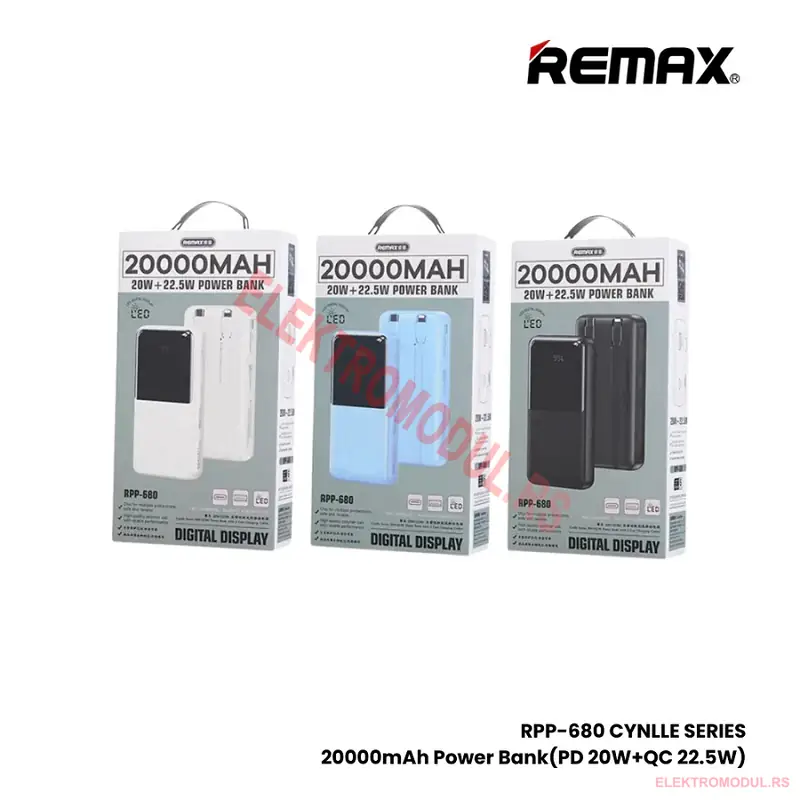REMAX RPP-680 20000mAh 20W+22.5W Power Bank sa 2 Kabla je solidan izbor za sve koji zele pouzdanu rezervnu bateriju za svoje uredjaje. Sa kapacitetom od 20000 mAh i 20W PD + 22.5W QC fast charging, pokriva svakodnevne potrebe vecine korisnika. Po ceni od 2.830 din nudi dobru vrednost za novac. Dostupan online u Srbiji.