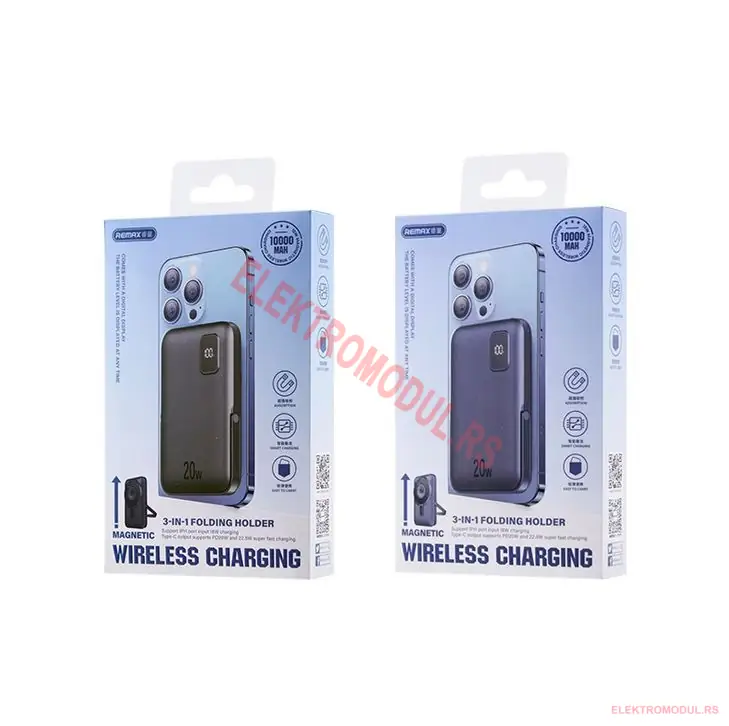 REMAX RPP-695 3-in-1 15W Wireless Power Bank sa Stalkom je prenosna baterija (power bank) kapaciteta 10000 mAh sa 15W wireless fast charging tehnologijom. 3-u-1 multifunkcionalna konstrukcija — istovremeno puni telefon, pametni sat I bezicne slusalice. Sklopivi stalak — telefon stoji pod uglom dok se puni. Idealno za kancelariju ili nocno punjenje pored kreveta. Po pristupacnoj ceni od 3.226 din nudi dovoljno energije za 3-4 puna punjenja prosecnog pametnog telefona.