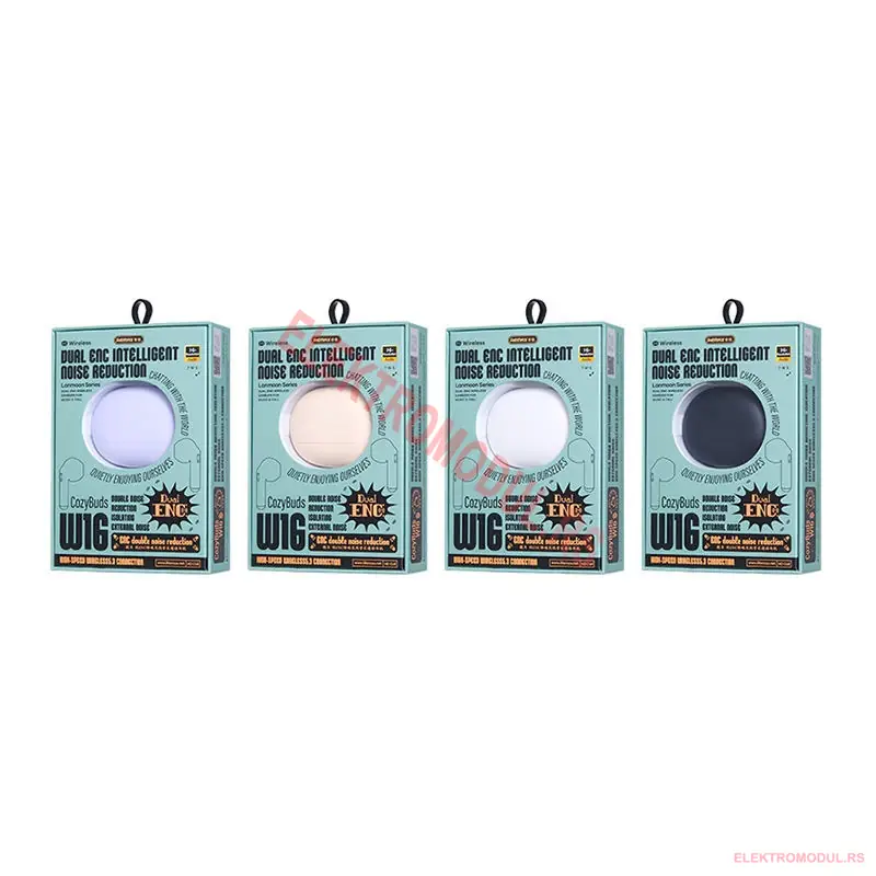REMAX W16 Lanmoon bezicne slusalice donose besprekoran zvuk i cist mikrofon u kompaktnom TWS Bluetooth pakovanju. Dual ENC tehnologija aktivno potiskuje pozadinske sumove tokom poziva, dok ergonomski oblik osigurava udobnost i tokom celodnevne upotrebe. Idealne za poslovne pozive, slusanje muzike, online sastanke i sportske aktivnosti.
