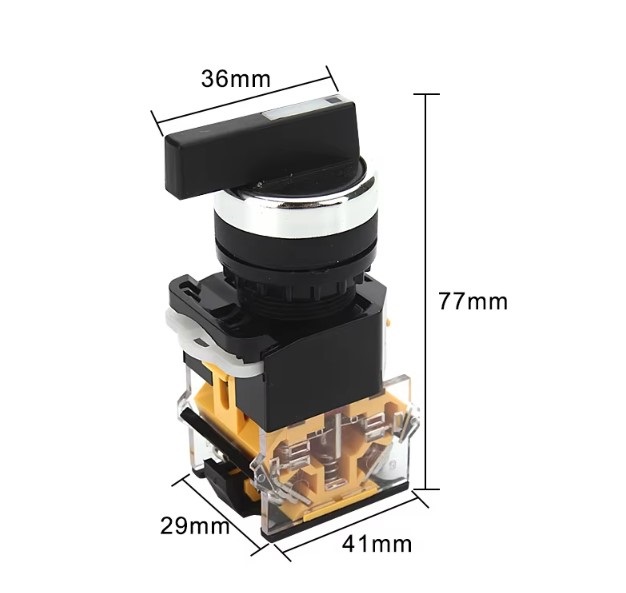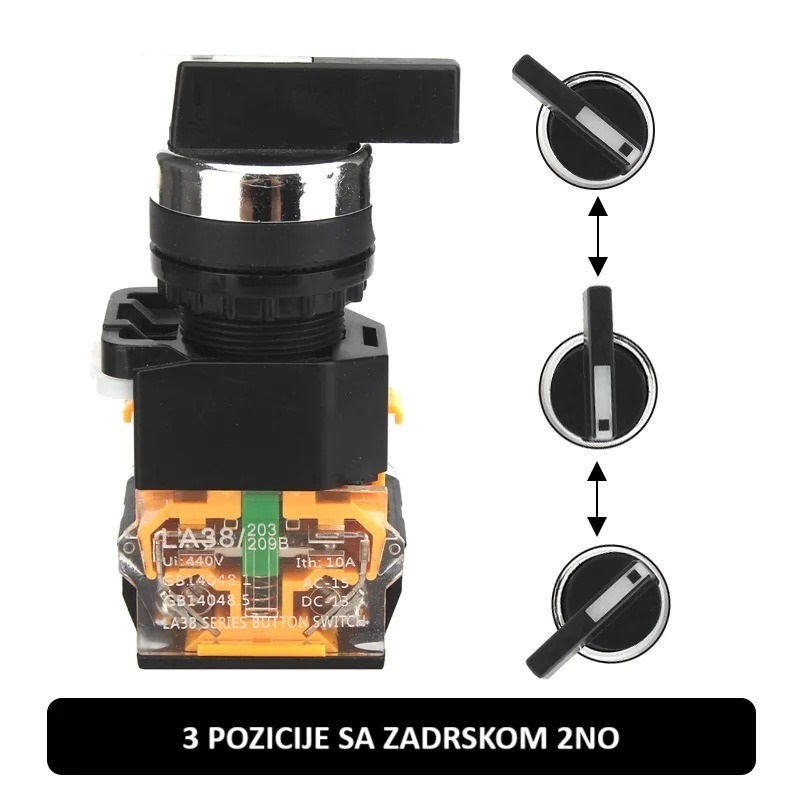 Rotacioni prekidač 22mm LA38-20CX3 sa tri pozicije i dva normalno otvorena (2NO) kontakta namenjen je za kontrolu i prebacivanje u upravljačkim panelima, industrijskim komandama i mašinskim sistemima.