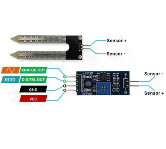 Modul koristi LM393 komparator čip, a pomoću potenciometra moguće je jednostavno podesiti prag vlažnosti zemljišta. Kada vlaga padne ispod podešene vrednosti, digitalni izlaz (DO) daje visok nivo, a kada je iznad – nizak nivo. Analogni izlaz (AO) pruža precizna merenja koja se mogu obraditi preko AD konverzije.