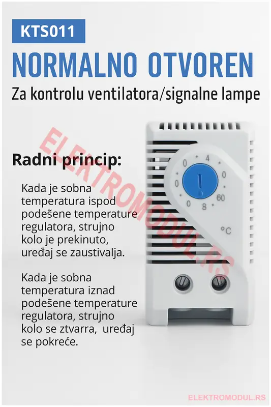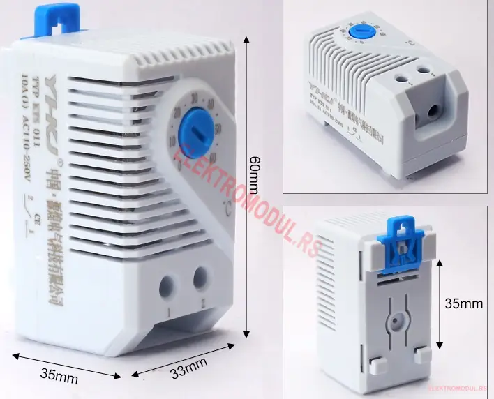 Tražite pouzdanu i jednostavnu kontrolu temperature u razvodnim ormarima, panelima i mašinama? Termostat za elektro ormare KTO011  0–60°C Cena Srbija je mehanički regulator sa NC kontaktima namenjen za  grejanje . Opseg podešavanja je 0–60°C (potvrđeno: 0–60 stepeni su), a montaža na DIN šinu 35 mm omogućava brzu ugradnju bez alata.