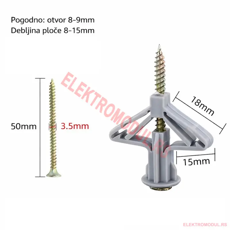 - Dimenzije anker “krila”: približno 18 mm × 15 mm (kada se raširi u ploči)