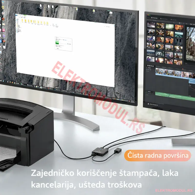 - Štedi prostor i troškove: dva računara dele dve USB periferije.